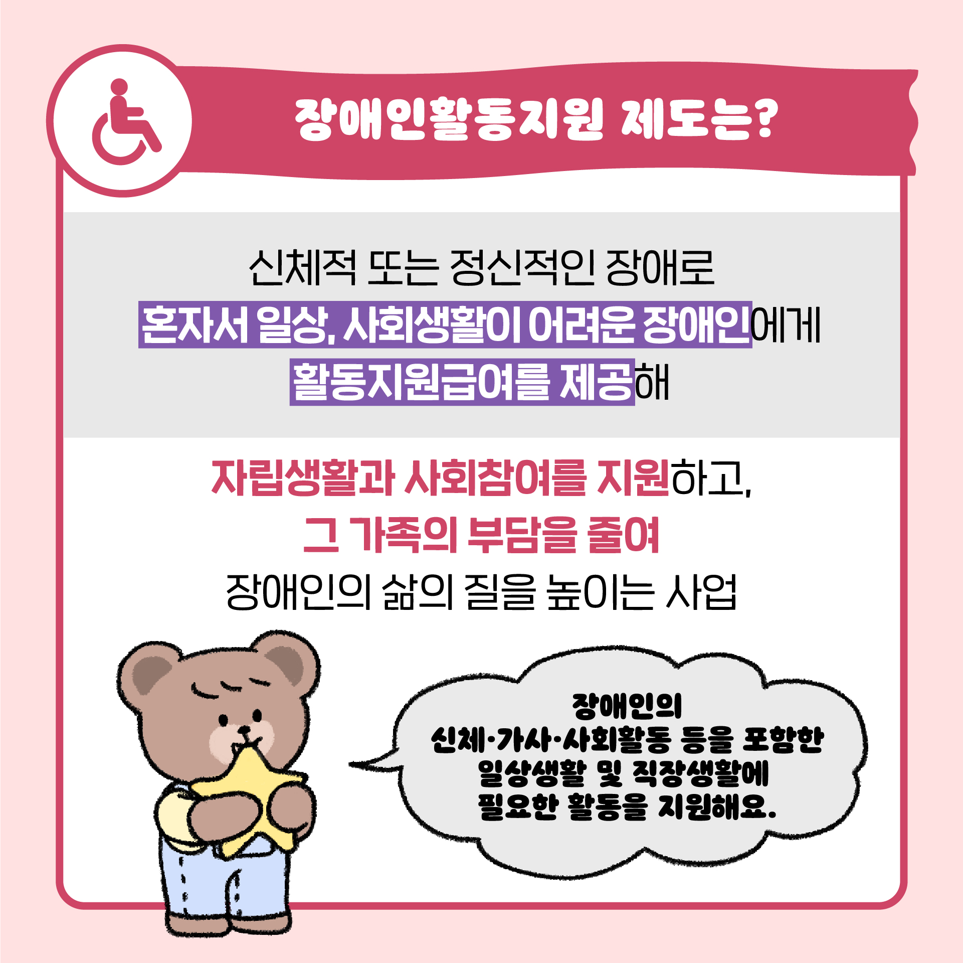 - 장애인의 자립생활 촉진 및 사회참여 확대 목적