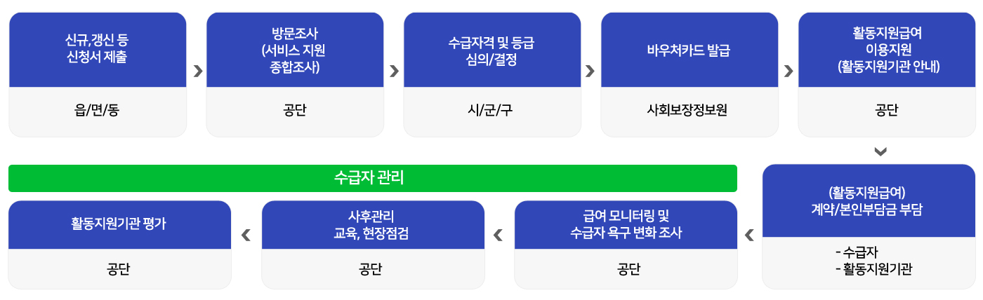 장애인 활동지원급여 신청은 다음과 같은 절차로 진행됩니다: