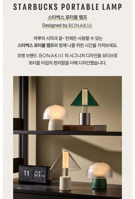 스타벅스 포터블 램프는 조명 브랜드 BONAKIA의 시그니처 디자인을 모티브로 제작되었습니다. 총 4가지 종류로 제공되며, 스타벅스 감성을 담은 보나키아-K그린, 차분한 무드의 보나키아-K화이트, 부드러운 곡선이 특징인 보나키아-T그린, 어디에나 잘 어울리는 보나키아-T화이트 중 선택할 수 있습니다. USB 타입 충전이 가능하고, 3단계 밝기 조정이 가능해 원하는 무드에 맞춰 사용할 수 있습니다. 충전 시간은 약 2시간이며, 사용 시간은 밝기 단계에 따라 약 5시간에서 최대 70시간까지 가능합니다.