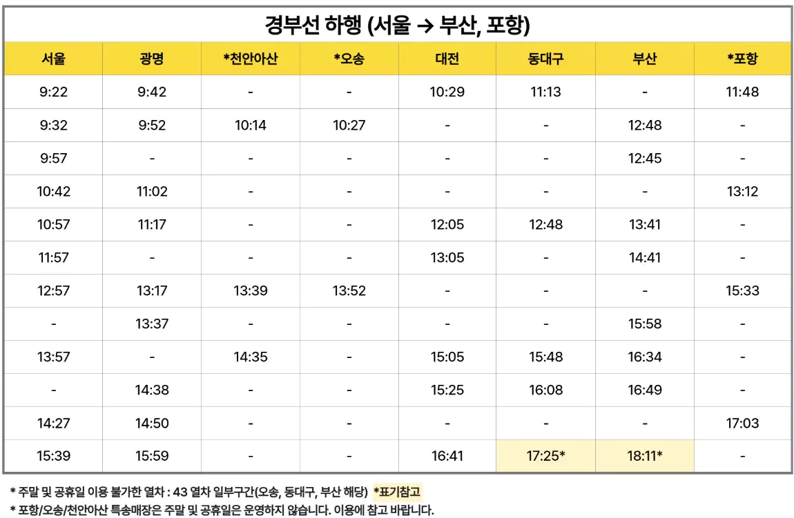 - 예약 시간: 기차 출발 40분 전까지 반드시 접수 완료