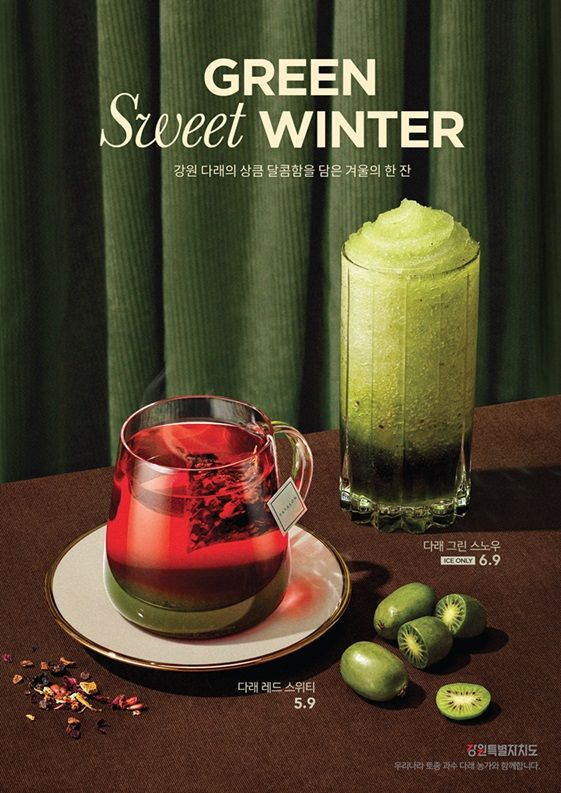 - 그린 윈터 다래 스노우: 국내산 자연 다래와 얼음만을 사용해 만든 음료로, 다래 본연의 맛과 색상을 그대로 살렸습니다. 제철 과일의 신선함을 그대로 느낄 수 있는 것이 특징입니다.